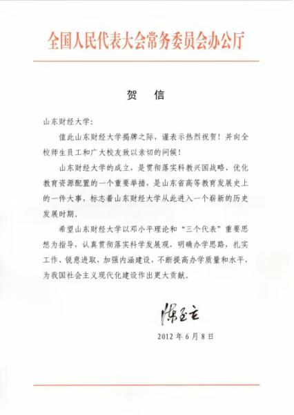 2012年6月8日,全国人大常委会副委员长陈至立为山东财经大学成立致贺信。